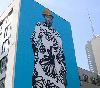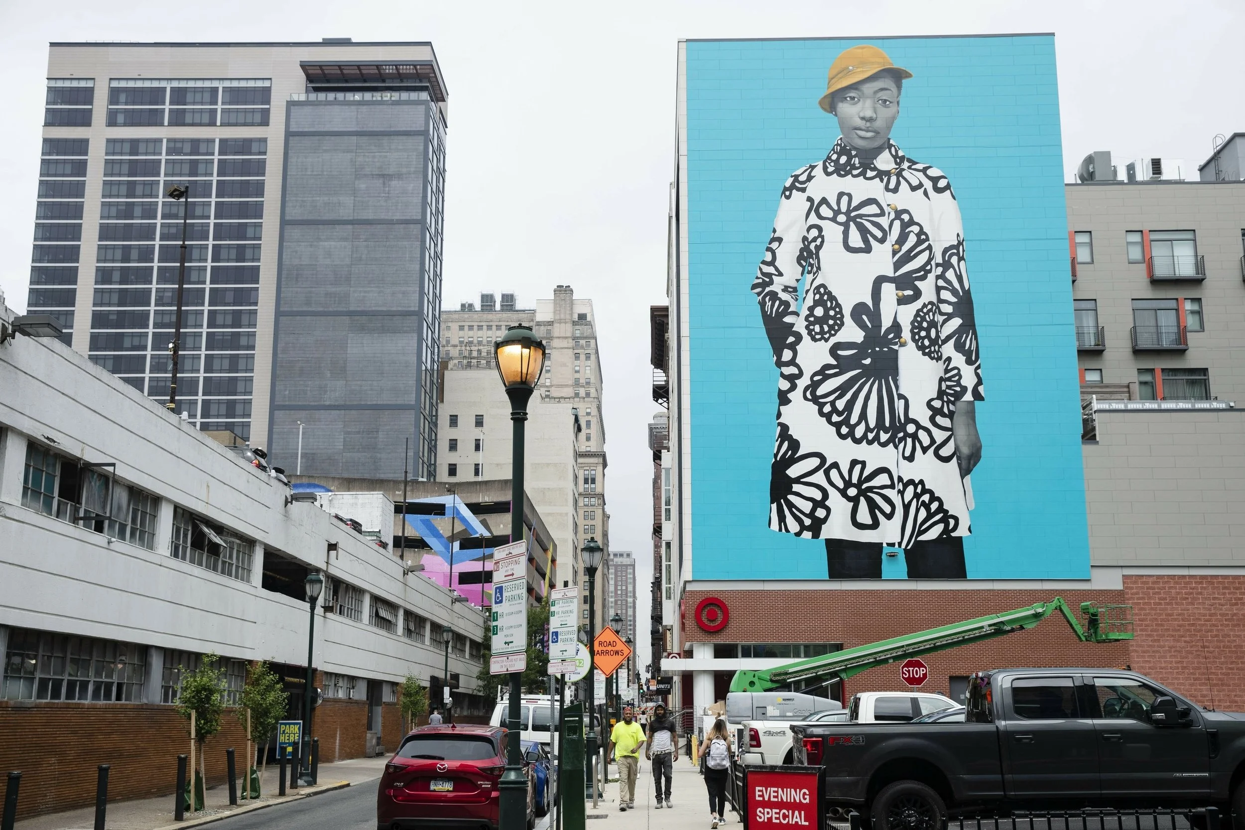 This is my favorite one because I love this girl’s style! This six‑story portrait by acclaimed artist Amy Sherald features North Philly teen Najee Spencer‑Young, rendered in Sherald’s signature grayscale style. The bold black‑and‑white coat, mustard hat, and vibrant background make it one of Center City’s most unforgettable murals — a striking celebration of identity and representation in the heart of Philadelphia. If the name Amy Sherald sounds familiar, it is because she also painted the official portrait of Michelle Obama!
